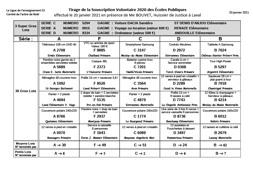 Le tirage de la Souscription Volontaire des écoles publiques de la Mayenne organisé par le Comité de l’Arbre de Noël et la Ligue de l’enseignement – FAL 53 a eu lieu le mercredi 20 janvier 2021 en présence de Maître Bouvet.